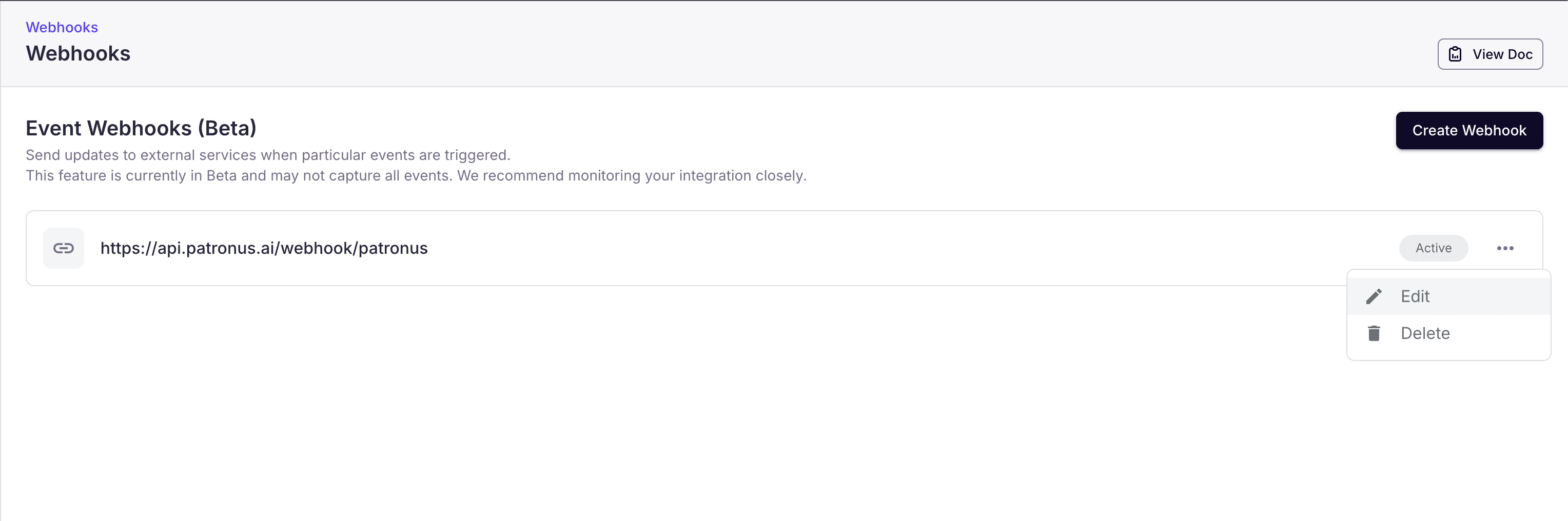 You can Edit or Delete your integration at any time by clicking the three dot menu on a Webhook